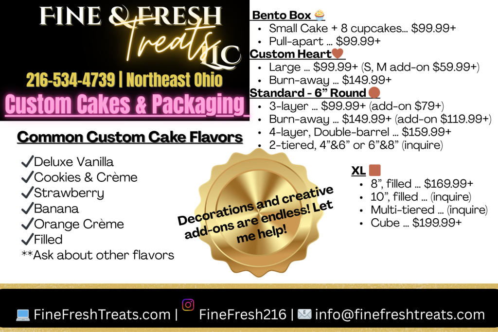 At Fine & Fresh Treats, we craft mouthwatering cakes and delightful treats just for you! Made with love in Cleveland, our treats bring joy to every celebration. Taste the magic today!