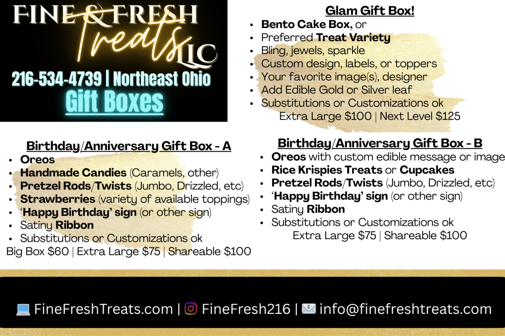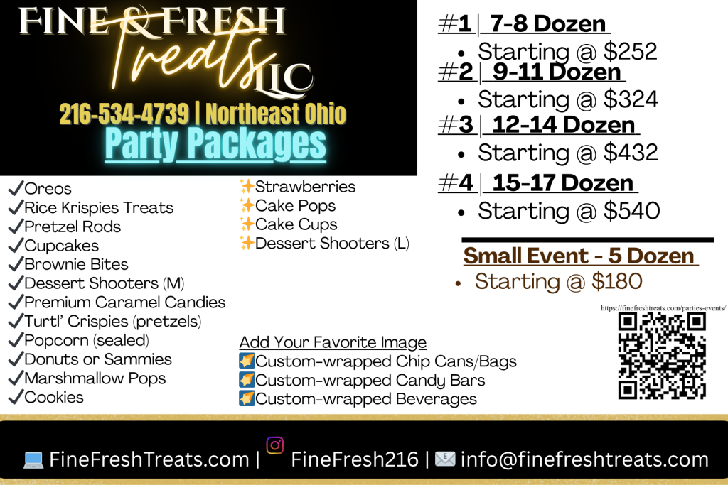 While Fine & Fresh Treats specializes in Custom treats for you, we recognize that sometimes you’ll want to make a quick pick. To meet that need, we’ve included Quick Pick Party Package options for you. These are customizable, as well.