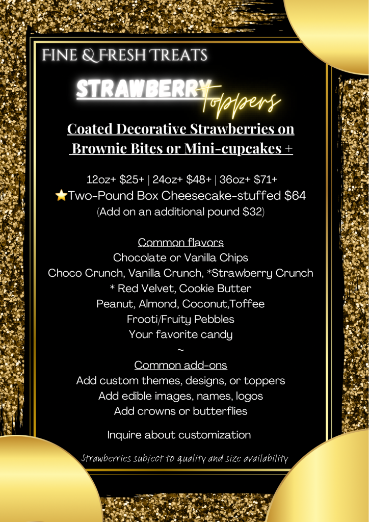 At Fine & Fresh Treats, we turn juicy strawberries into sweet masterpieces! Each bite is a burst of flavor, crafted with love right here in Cleveland. Treat yourself today!